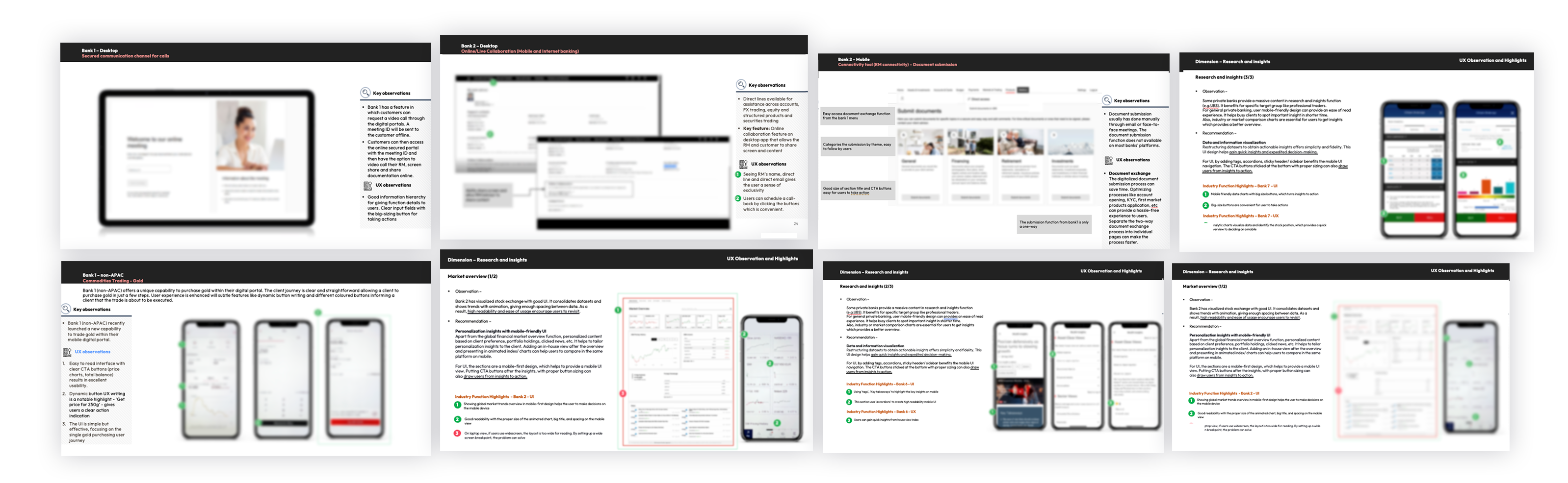 We went through 7 private banks’ digital platforms and over 50 functions. We highlighted usability issues, unique functions, and offerings. We ranked the competitors' key dimensions with scores and provided recommendations to our client based on our findings.