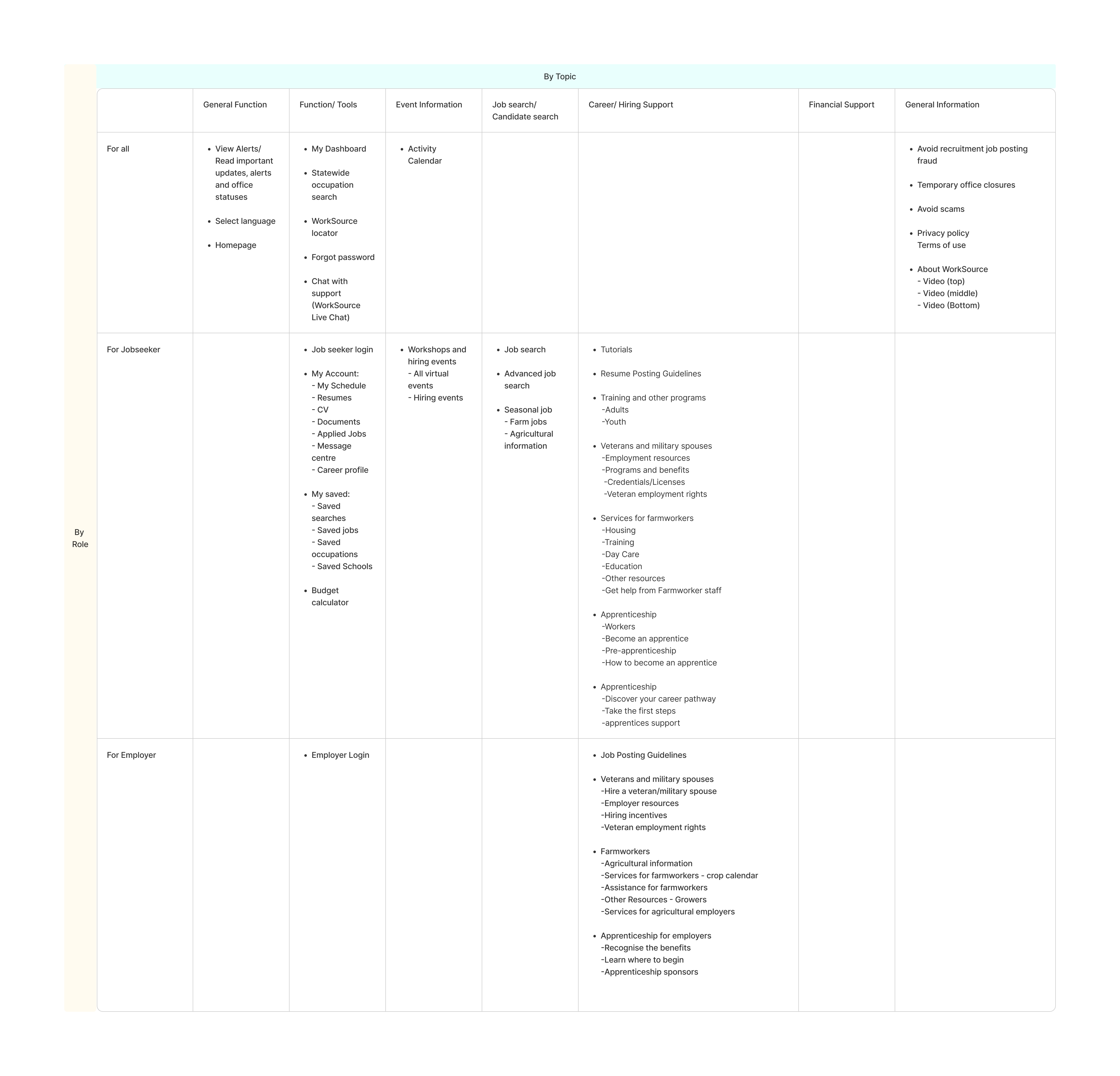 By Topic – Organizing content by topics such as job searching, employer resources, training programs, and career advice helps users easily navigate and find information based on their specific interests or needs.