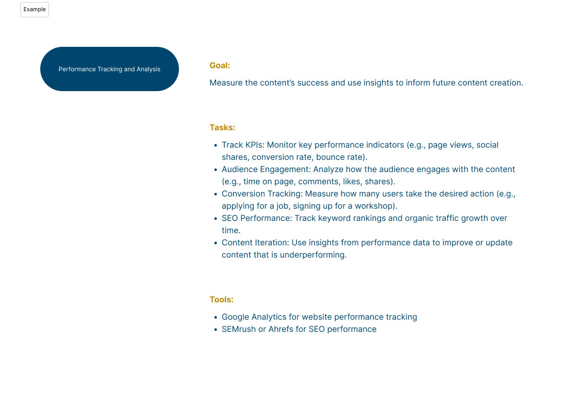 5. Content Creation Plan - I developed a streamlined content creation workflow for WorkSourceWA to ensure consistency, quality, and alignment with strategic goals. This internal process guides content from ideation to publishing and performance analysis—making it easier for teams to create user-focused content for jobseekers, employers, and other key audiences.