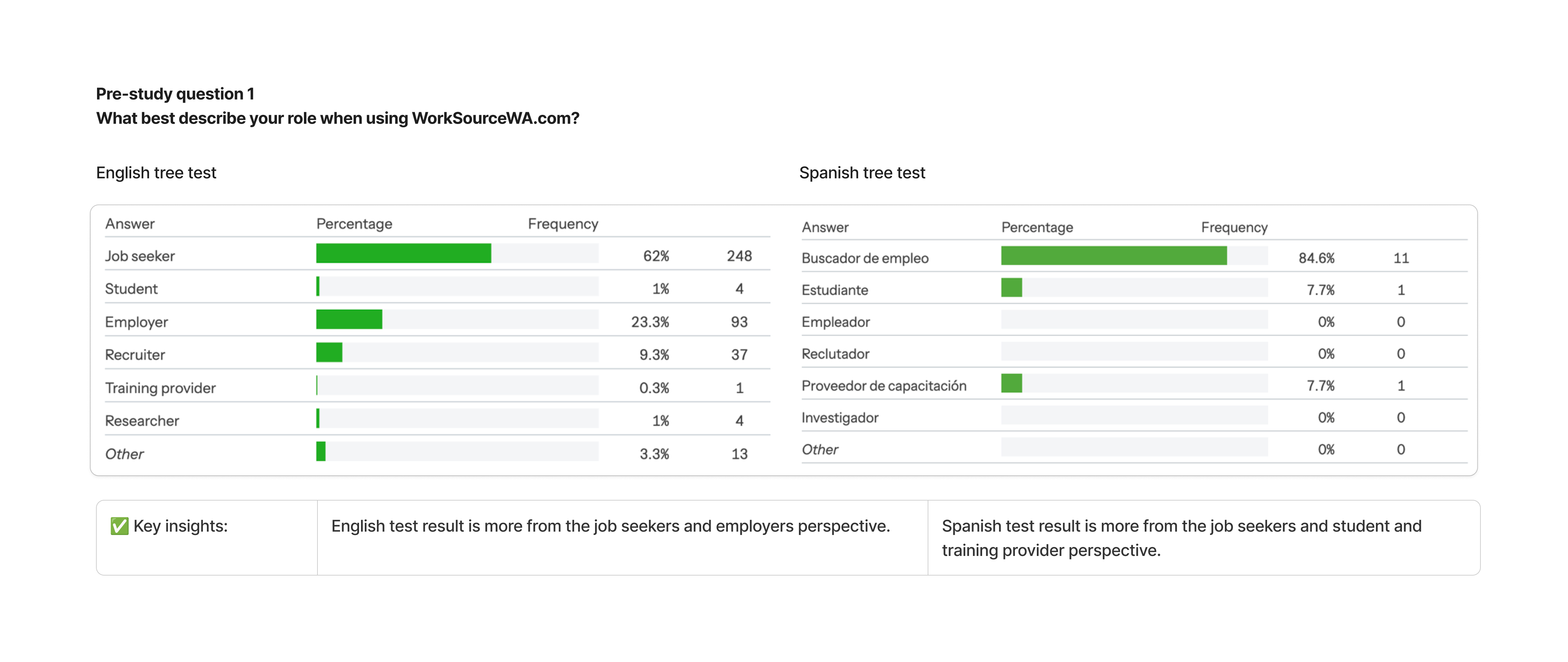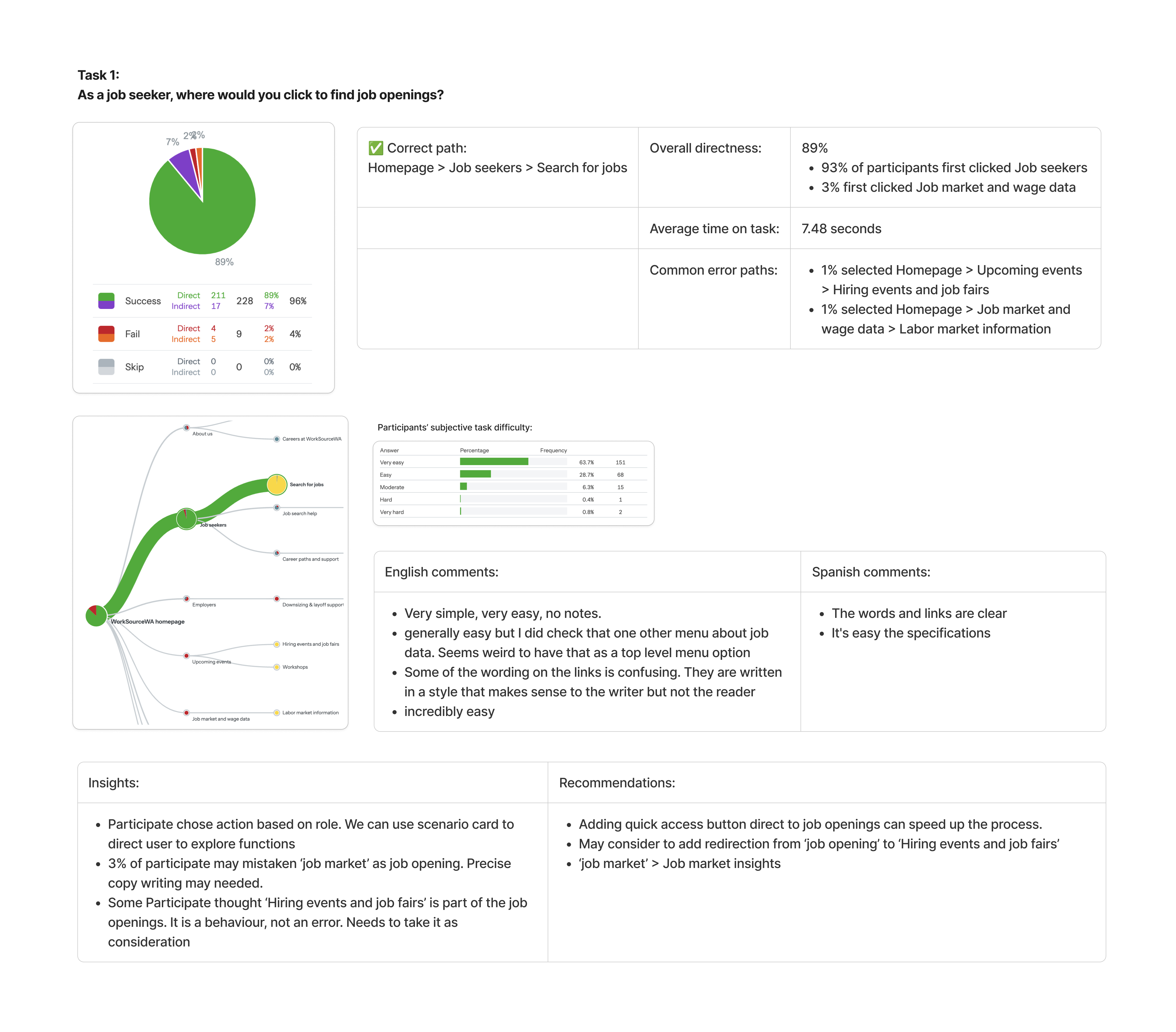 - Tested draft IA based on preliminary card sort results for English speaking job seekers and employers, using Optimal Workshop, an unmoderated online tree testing tool