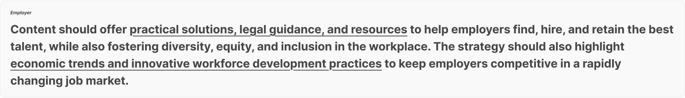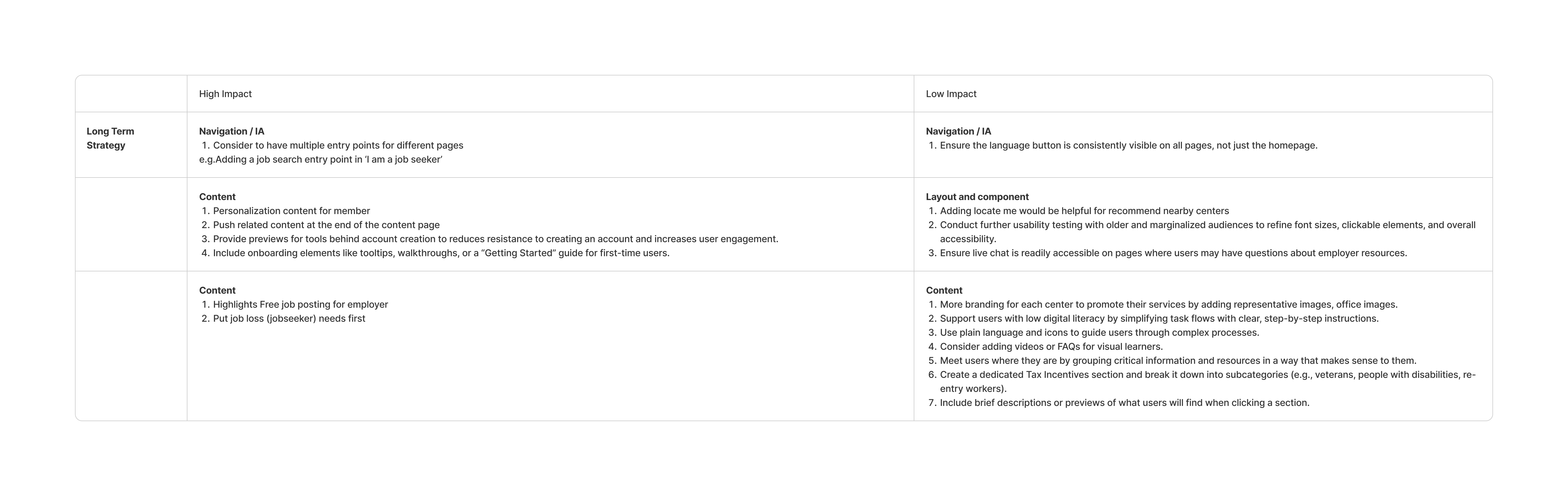 2. Audience Analysis - To align the team around user needs, I consolidated input from 3 key user groups—jobseekers, employers, and staff—into five actionable personas that informed both content strategy and UX design.