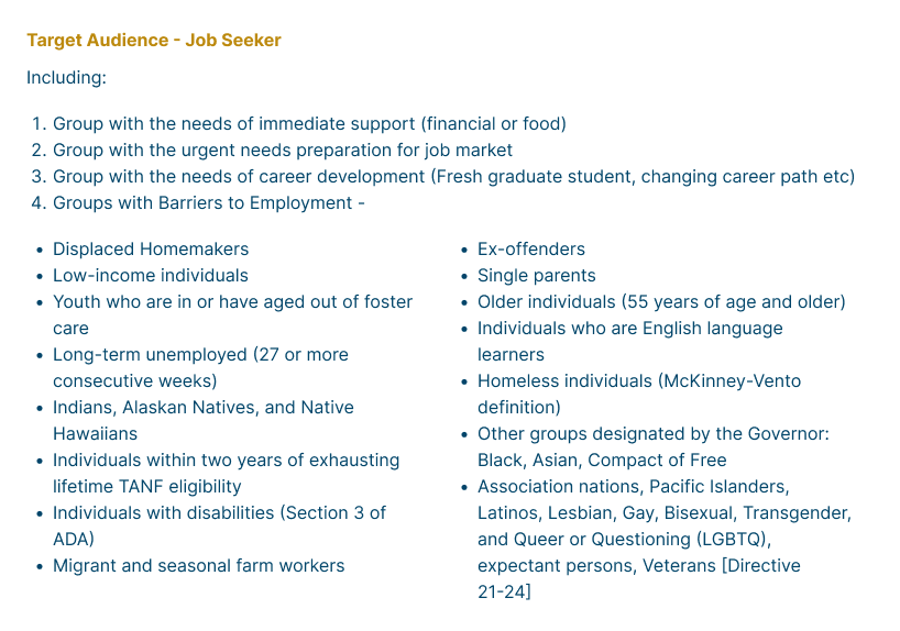 (e.g., Ethan’s Persona)Encouraging, Motivational, Forward-Looking “Starting your career journey or taking it in a new direction? We’re here to guide you through every step.” Groups with Barriers to Employment Empowering, Inclusive, Reassuring “Whatever challenges you’re facing, we believe in your potential. Let us help you overcome those barriers and achieve your career goals.” Employers Professional, Solution-Oriented, Collaborative “Finding the right talent is critical for your business. Let us help you streamline the process with our personalized employer services.”